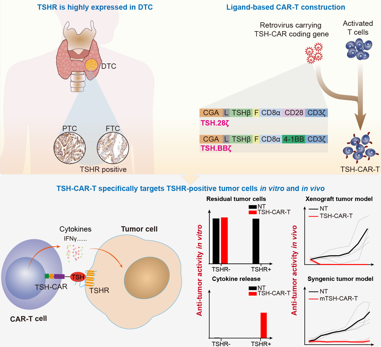CAR-T疗法在实体瘤治疗中面临重大挑战,包括靶向抗原的缺乏和CAR分子的免疫原性。TSHR被证实在分化型甲状腺癌(DTC)中特异表达,在人体除甲状腺外的其他正常组织中不表达,是CAR-T疗法的理想靶点。该研究基于天然“配体-受体”间的特异性相互作用,利用天然配体TSH替代scFv序列,构建了靶向甲状腺癌特异抗原TSHR的CAR分子,解决了因CAR分子的免疫原性导致CAR-T细胞被免疫系统清除,造成CAR-T持久性不足的问题。