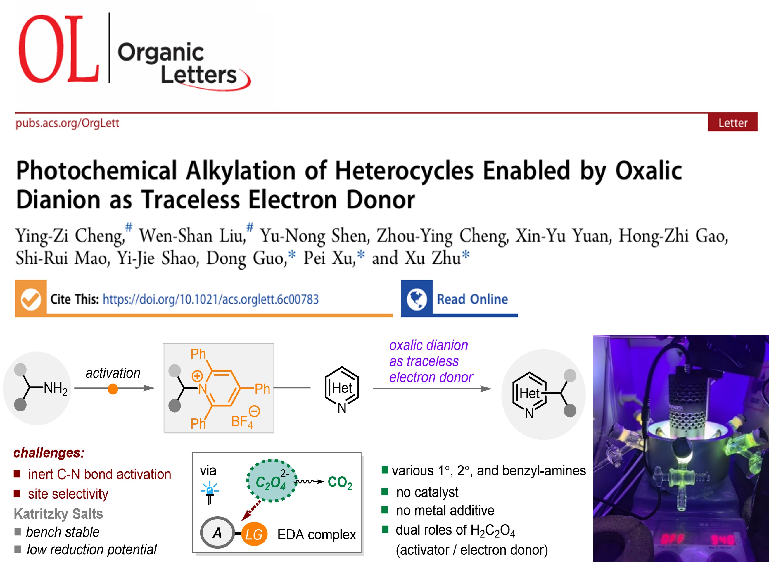 杂环类药物分子骨架(如吡啶、喹啉等)的修饰是药物合成领域的重要挑战。药学院本科生科创团队针对这一难题开展系统性研究并取得重要进展,相关成果近日发表于国际知名期刊《Organic Letters》。