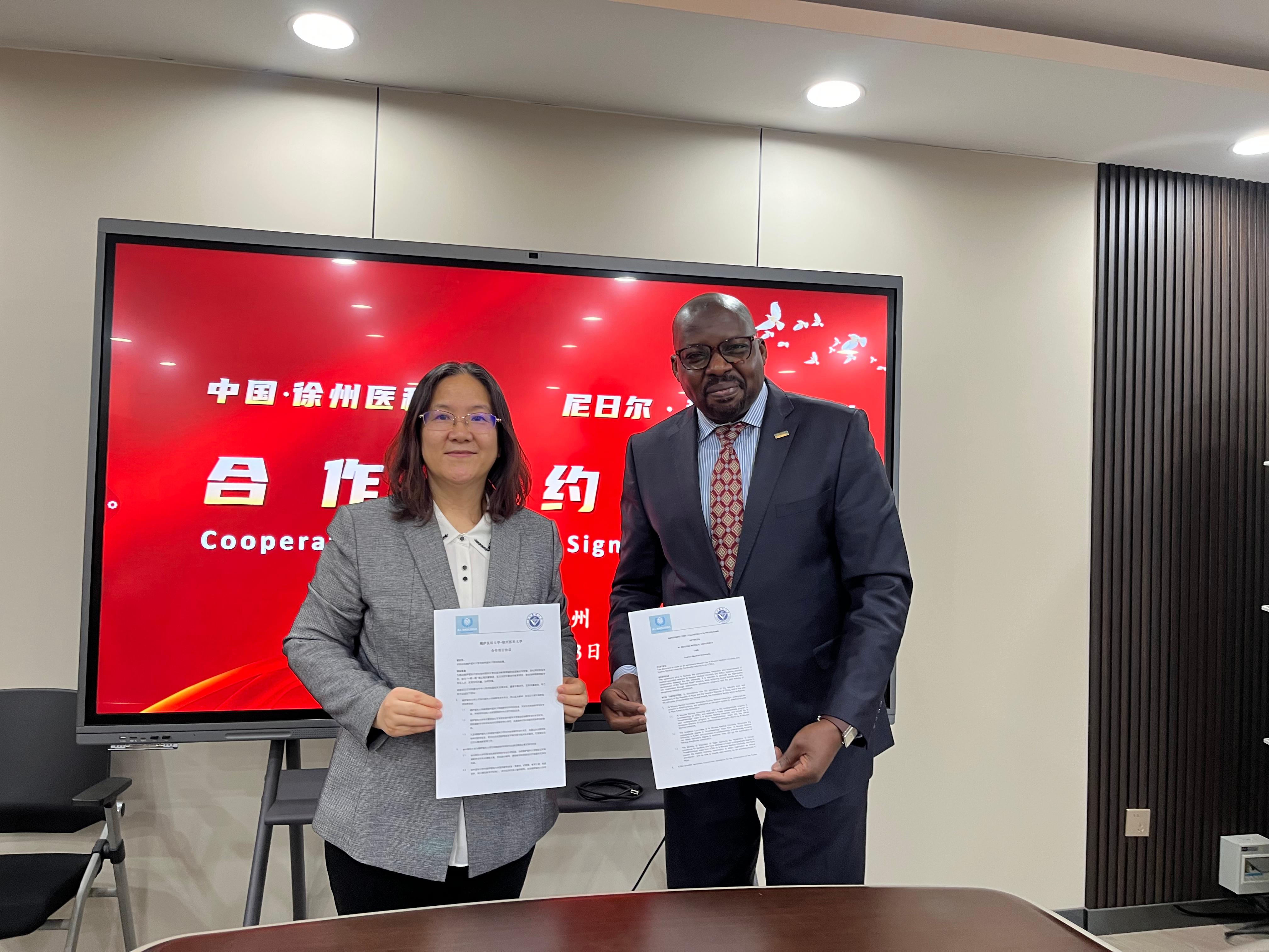 签约仪式上,张卓琦对穆萨教授的到访表示热烈欢迎。她介绍,穆萨教授不仅拥有美国高校的执教经验,更扎根西非,创办医疗教育机构,其工作对国家健康事业意义重大。穆萨教授高度赞扬了我校的办学成就和学科实力。他表示,作为尼日尔教育部授权的穆萨医科大学创始人,他深知本地医疗人才培养的迫切性,徐州医科大学在麻醉学领域的雄厚实力和丰富经验,将直接助力穆萨医科大学建立起高水平的麻醉医学人才培养体系,显著提升尼日尔及西非地区的医疗服务质量。